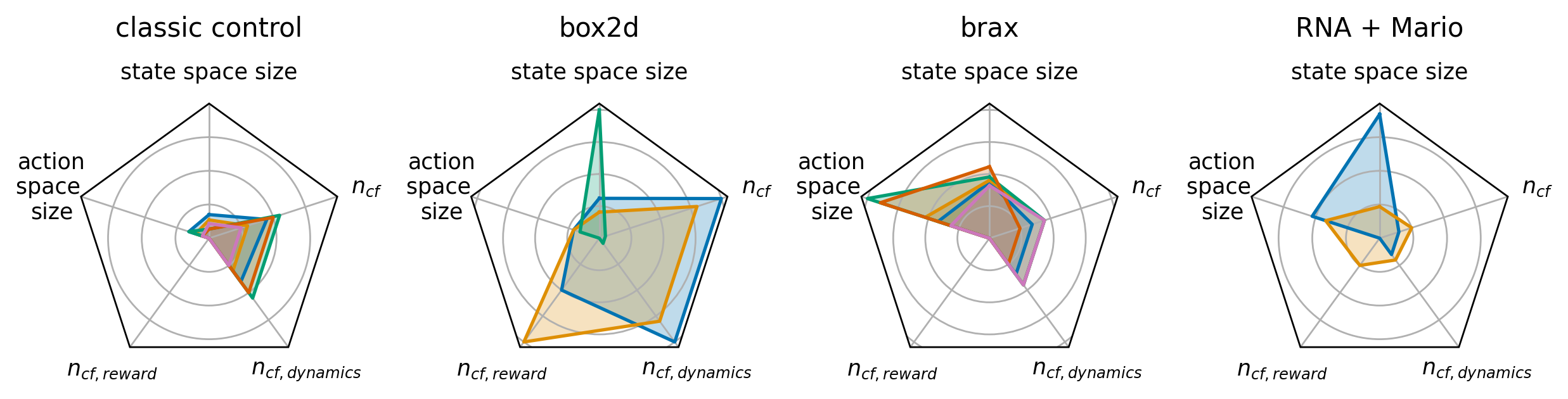We cover different kinds of reward signals with our benchmarks, ranging from relatively sparse step penalty style rewards where the agent only receives a reward of -1 each step to complex composite reward functions in e.g. the Brax-based environments. The latter version is also quite informative, providing updates on factors like movement economy and progress towards the goal whereas the former does not let the agents distinguish between transitions without looking at the whole episode. % this sentence could be dropped if space is needed Further examples for sparse rewards are the CARLCartPoleEnv and CARLVehicleRacingEnv.
